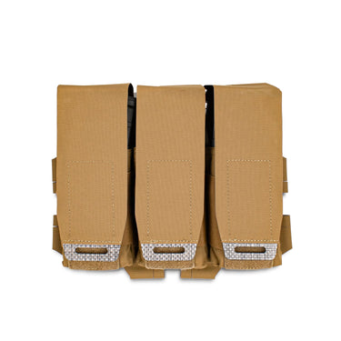 The Six-Banger Placard is a high-capacity modular placard system designed to integrate with plate carriers or chest rigs. It features three primary magazine pockets, each divided into two retention cells by Tegris® thermoplastic, offering secure storage and easy re-indexing. The setup supports up to six 5.56 magazines or similarly sized gear.