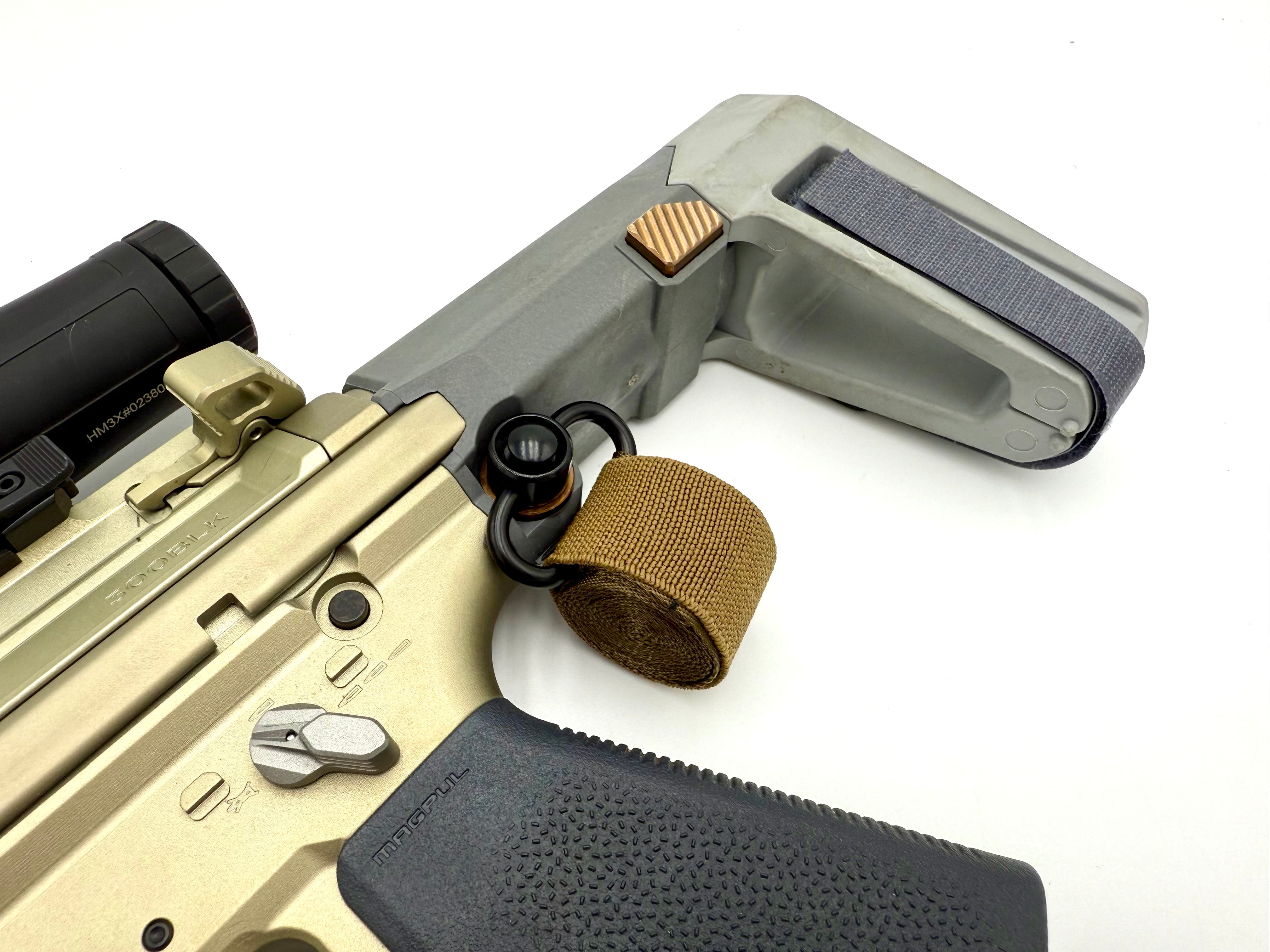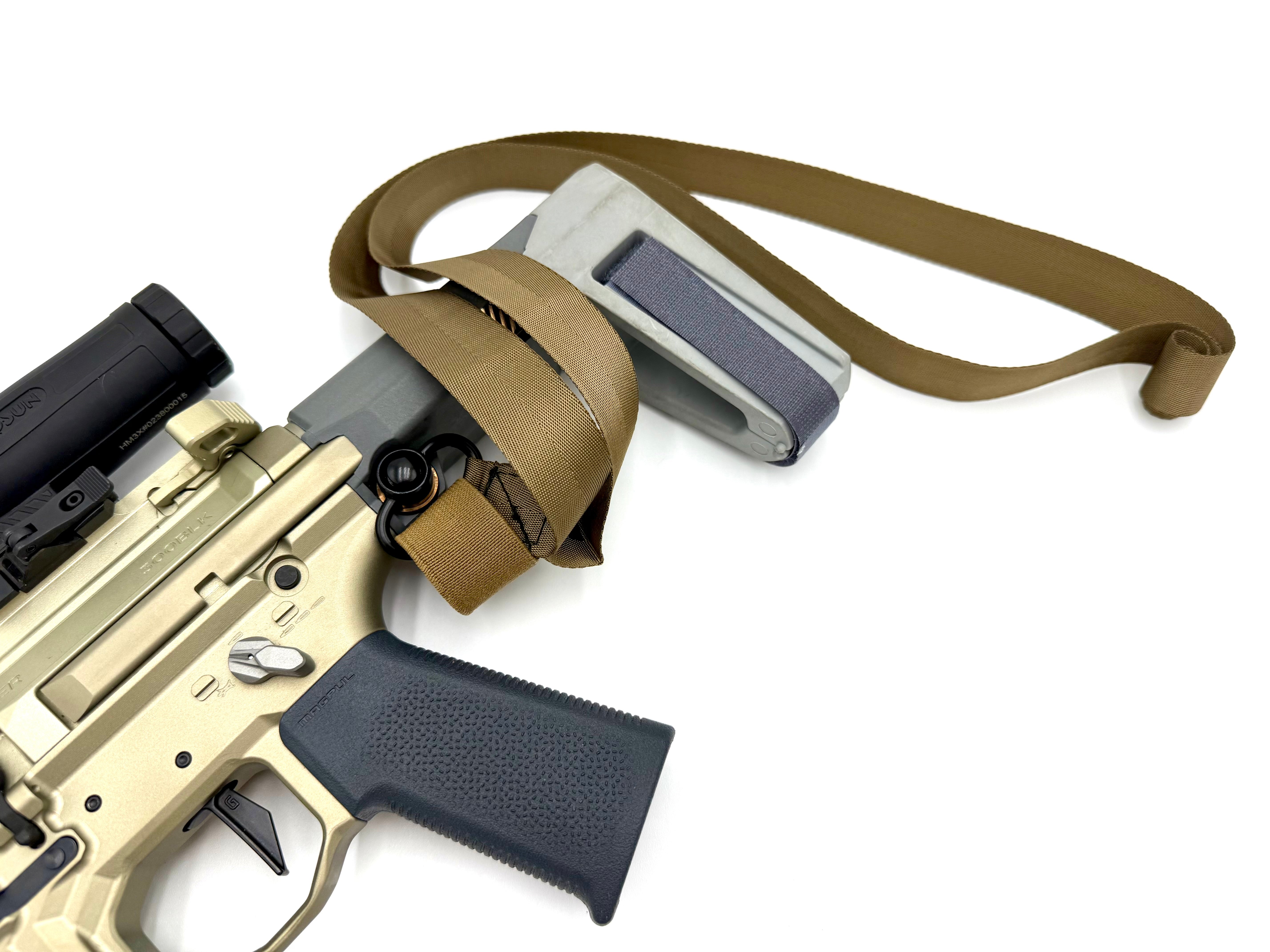 The SPLIF (Single Point Launch Immediate Firearm) Sling smokes the competition with our unique quick deploy single point sling you can say goodbye to your old bulky sling that gets in the way while not in use. The SPLIF Sling rolls up to slightly bigger than a quarter so you can leave it attached to your firearm without ever noticing it’s there until you need it. Just push through the side with your thumb to quickly deploy the sling, throw it over your shoulder, then roll it back up when you’re done. We manufacture the SPLIF Sling in Orlando Florida with American Made Berry Compliant Mil-Spec QD swivels, webbing, elastic, and Kevlar aramid thread to make the most durable product possible. This sling is built for Mil-Spec use and abuse.